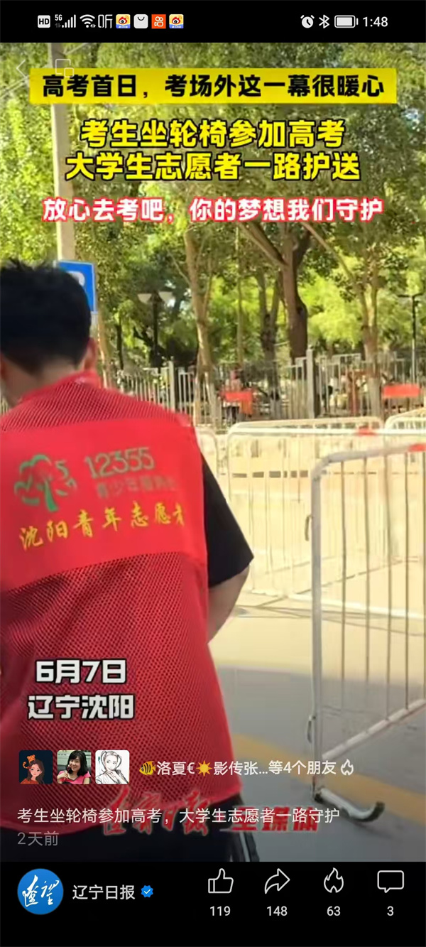 6月7日,高考第一天,沈阳城市学院青年志愿者团队以饱满的精神状态,为考生及家长提供全方位助考服务。期间,我校志愿者送行动不便考生进考场的暖心事迹,被新华社和辽宁日报报道,截至目前,全网阅读量已破百万。我校志愿者团队的“爱心护考”志愿服务行动,也被辽宁交通广播、辽沈晚报、沈阳广电云盛京、共青团沈阳市委员会“青春沈阳”等媒体相继报道。