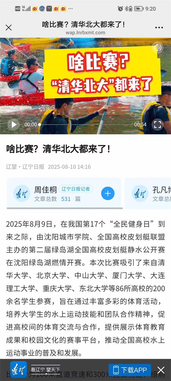 2025年8月9日,在我国第17个“全民健身日”到来之际,由沈阳城市学院、全国高校皮划艇联盟主办的第二届绿岛湖全国高校皮划艇静水公开赛在沈阳绿岛湖燃情开赛。本次比赛吸引了来自清华大学、北京大学、中山大学、厦门大学、大连理工大学、重庆大学、东北大学等86所高校的200余名学生参赛。此次比赛得到了中国日报抖音海外版、辽宁卫视、辽宁日报等5家权威媒体的关注。