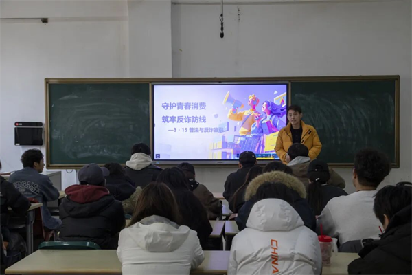 活动中,影视与艺术学院辅导员潘春阳老师围绕3·15国际消费者权益日的消费者权益保护相关法律法规、常见消费侵权场景,以及校园高发反诈案例、诈骗识别技巧、被骗后的应对方法等内容展开详细讲解,通过鲜活的真实案例分析、通俗易懂的法条解读,引导同学们深入理解反诈工作的重要性和消费者权益保护的核心意义,切实掌握防范诈骗、维护自身合法权益的实用方法。