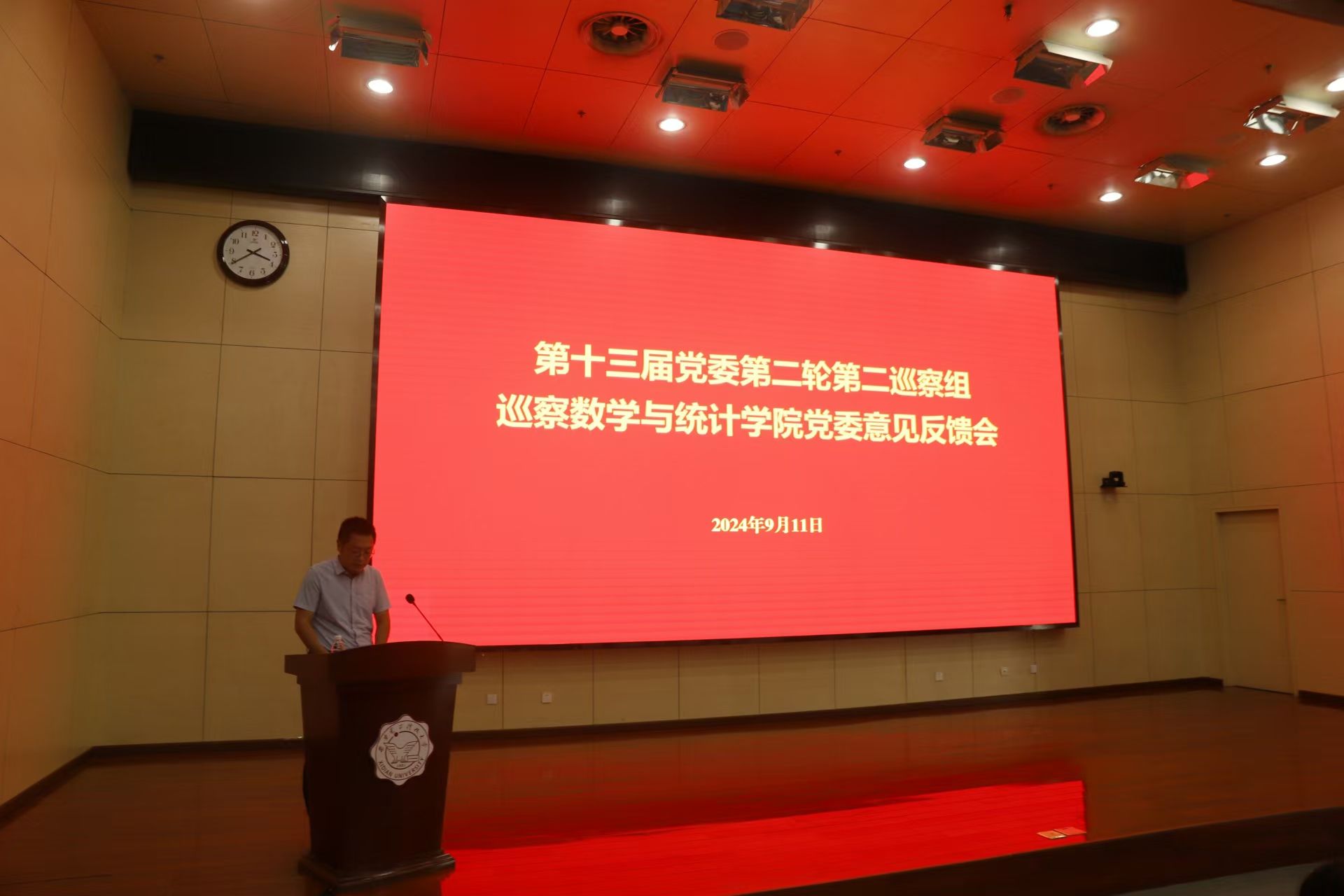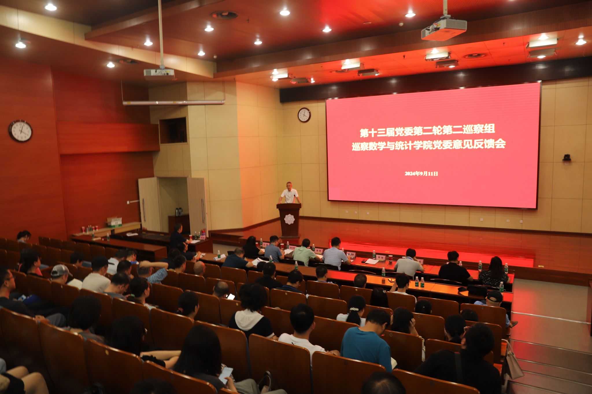 根据学校党委巡察工作统一部署,9月11日下午, 校党委第二轮第二巡察组向数学与统计学院党委反馈巡察情况。校党委副书记、纪委书记郭俊参加并讲话,巡察组组长张君博代表巡察组向数学与统计学院党委反馈了巡察意见,学院党委书记杨生海作表态发言,学院执行院长薄立军主持会议。会后,巡察组专门向学院领导班子深入沟通了巡察情况,提出了整改意见建议。