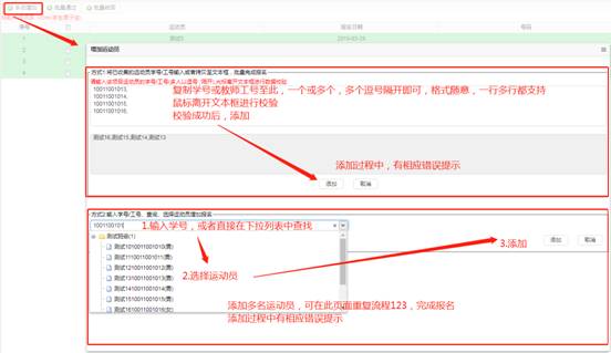 个人项目,点击行末‘查看报名情况’添加运动员。如果报名参加团体项目,需确认“团体报名”(上图红框位置),如果未确认,即使为该项目添加运动员,系统将认为未报名参加该团体项目。