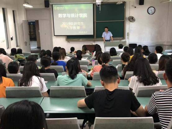 9月2日下午,数学与统计学院2019级博士、硕士研究生新生入学教育在南校区阶梯教室A109举行。数学与统计学院党委书记高俊亮、院长马如云、副院长吴事良,副书记王佩、研究生辅导员孙群老师以及2019级全体研究生新生参加了此次会议。大会由研究生辅导员孙群老师主持。