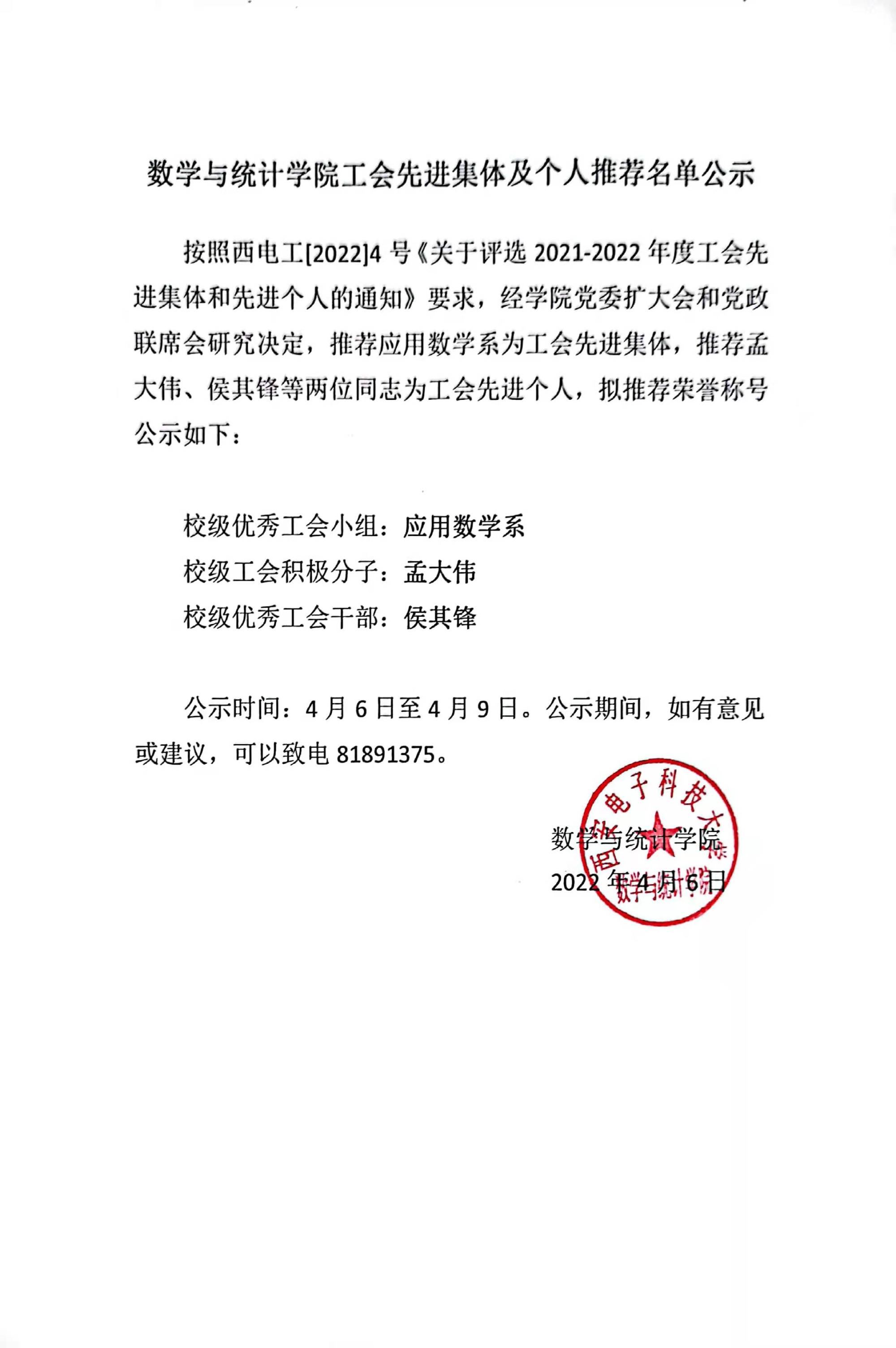数学与统计学院工会先进集体及个人推荐名单公示