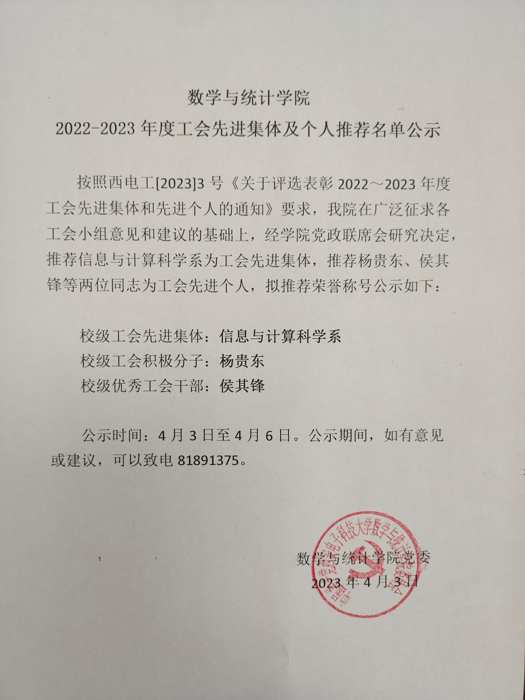 数学与统计学院2022-2023年度工会先进集体及个人推荐名单公示