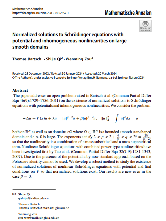 近日,西电数学与统计学院祁世杰教师与德国著名数学家Thomas Bartsch 教授、清华大学邹文明教授合作,在数学领域顶级期刊Mathematische Annalen上发表了题为“Normalized solutions to Schrödinger equations withpotential and inhomogeneous nonlinearities on large smooth domains”的长达47页的学术论文。 Mathematische Annalen 创建于1868年,致力于发表纯数学各领域具有突破性的重要成果,是业内公认的数学类顶级期刊,...